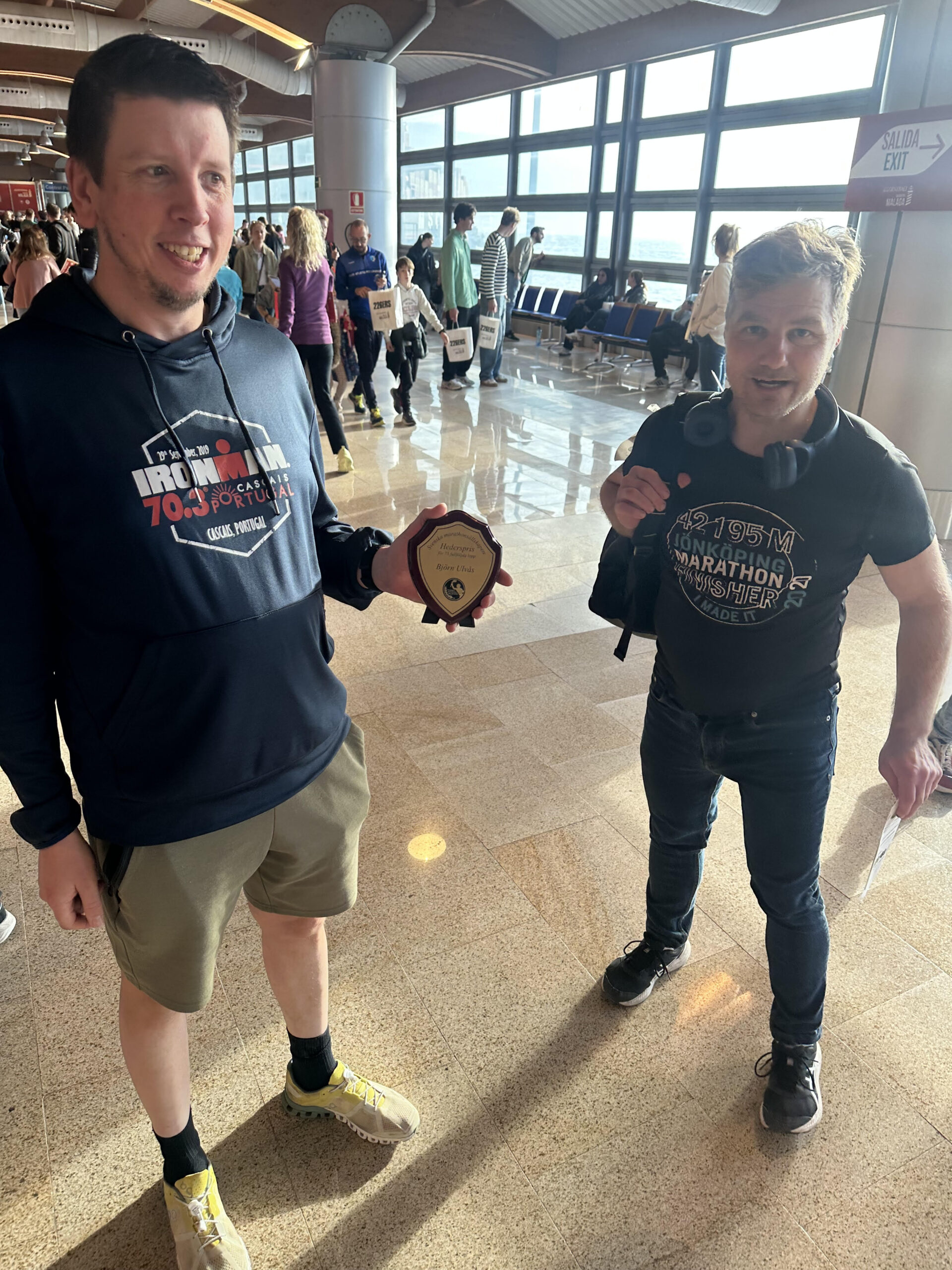 Här tar Björn Ulvås (till vänster) emot Svenska Marathonsällskapets plakett för 75 genomförda maratonlopp. Plaketten överlämnades av Sällskapets utmärkelseansvarige Mattias Ekman när de båda möttes
